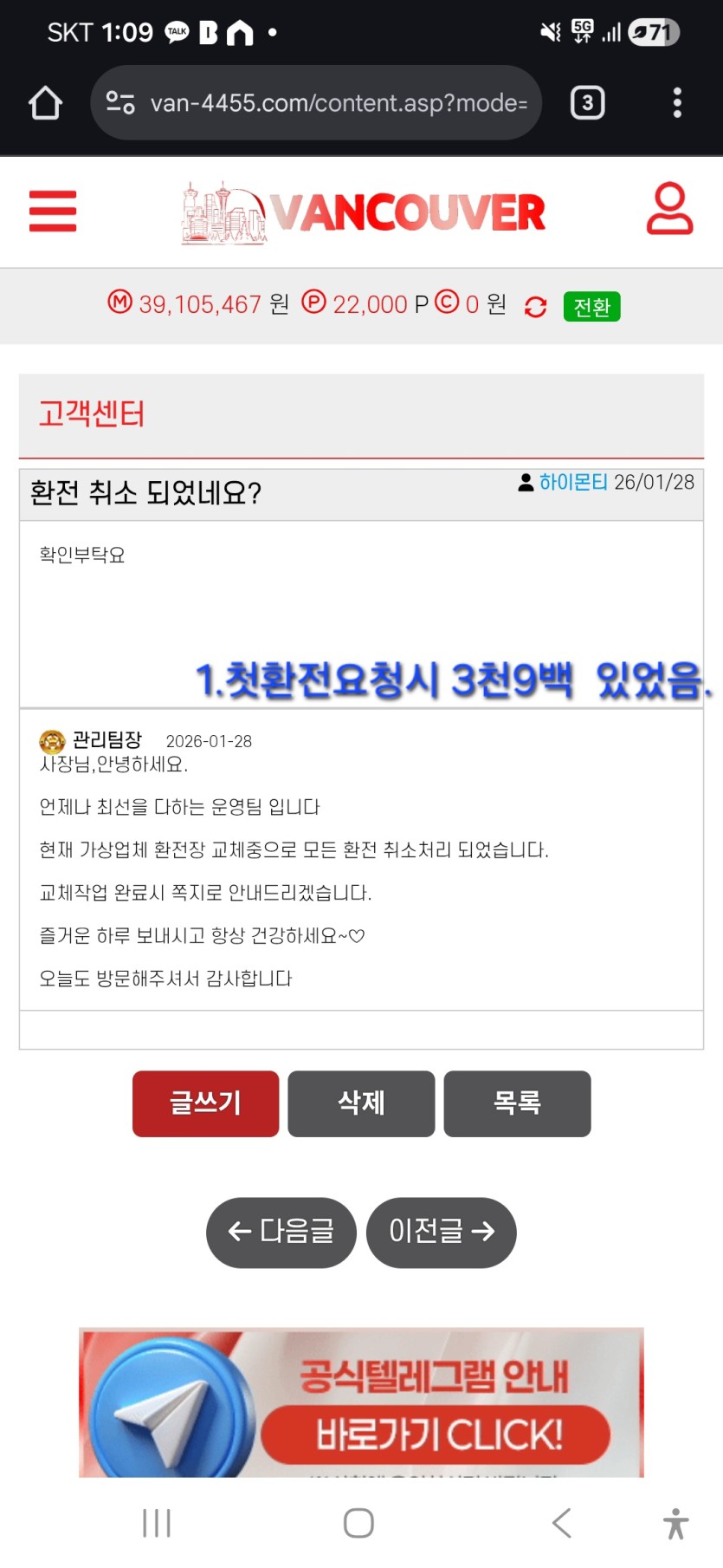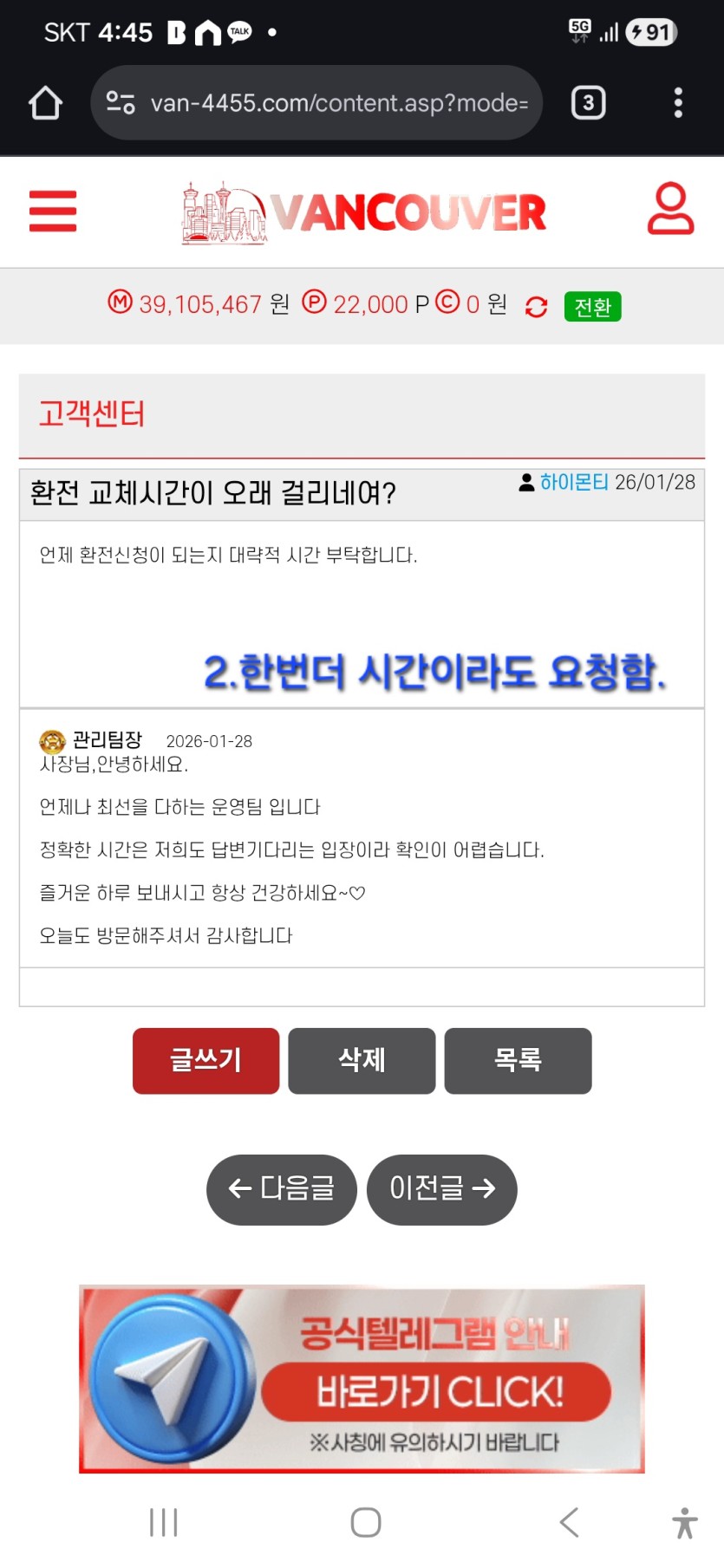 지들 계좌 털렸다고 환전 지연중에 있다함.