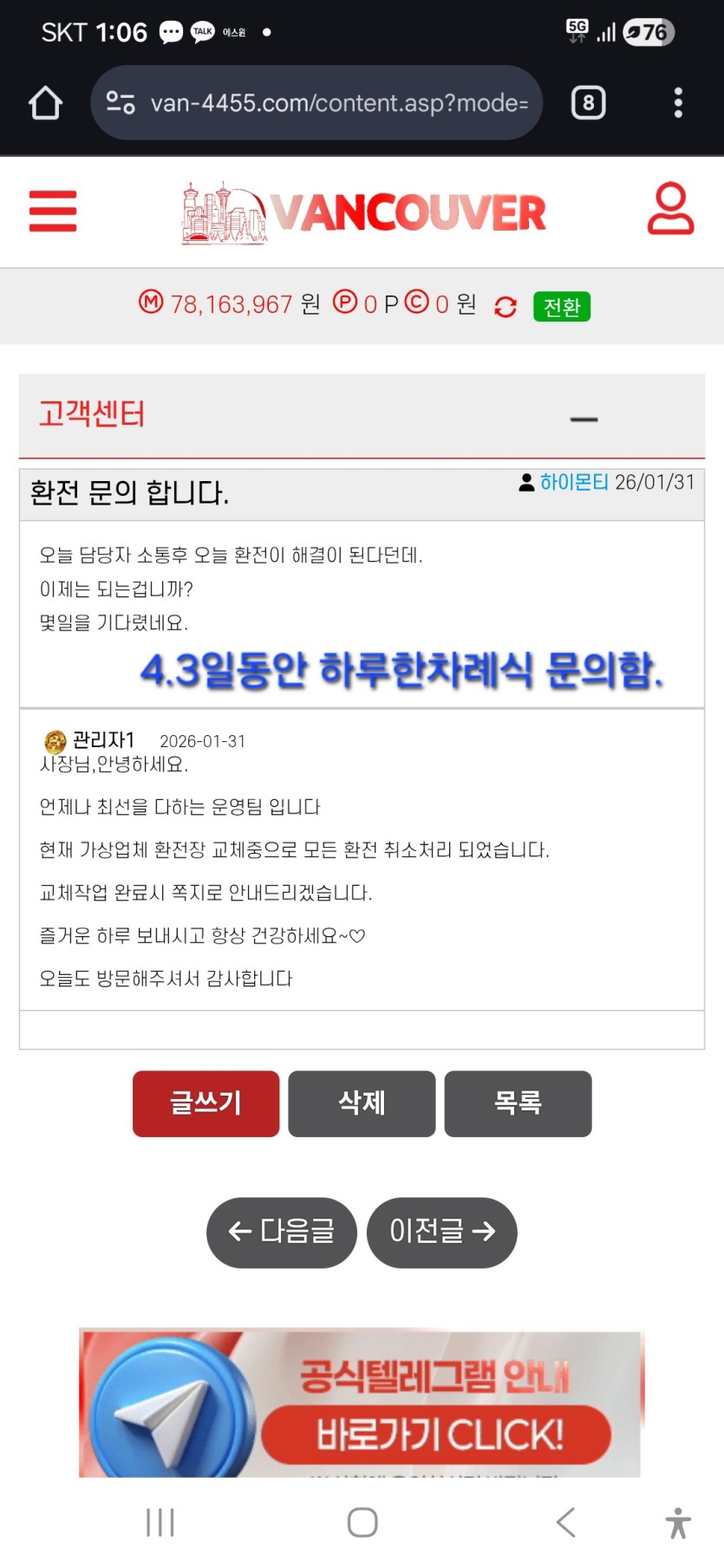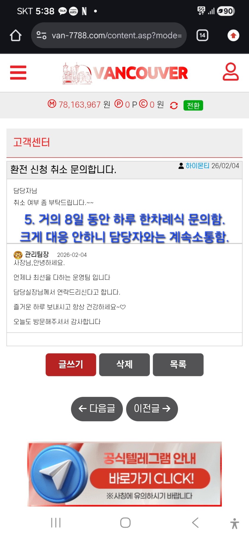 밴쿠버 7800가량 환전 못받고 있는중.