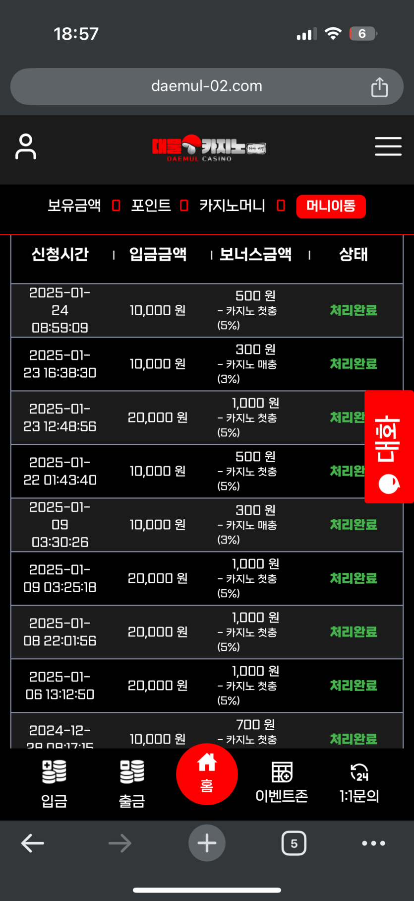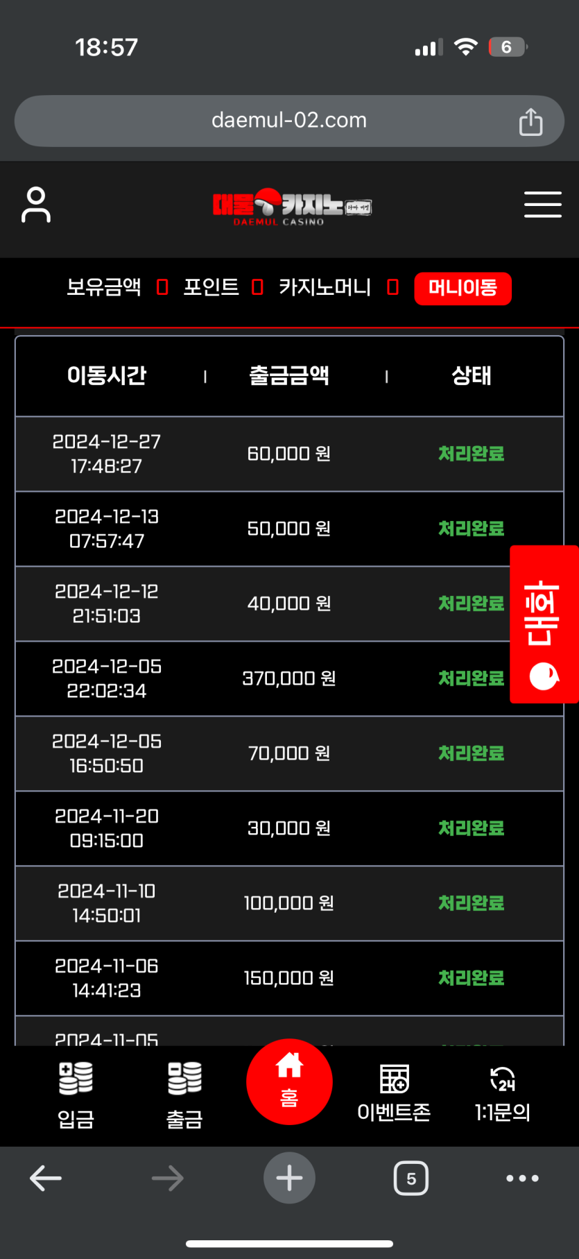 이용해봤는데 출금도 번개이구 정말 롤링포인트도 바로바로 들어오고 정말 사이트 잘고른거 같습니다.