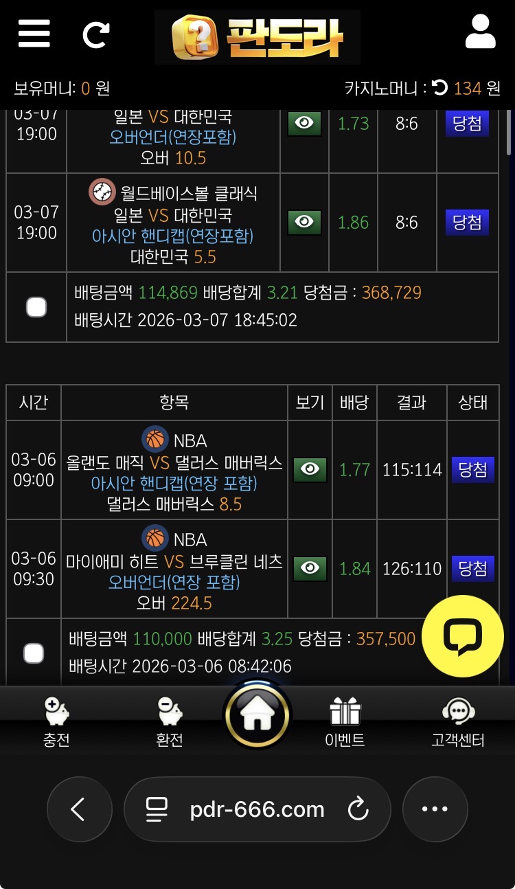 제가 오래도록 이용해오고 있는 사이트 인데요 운 좋게 wbc랑 느바 최근에 연속 두번으로 소액 먹긴했는데 ㅋㅋ 오늘은 날이 아닌가보네요 암튼 여기서 꽤 오래 이용할동안 사고 한번도 없었고 충환도 빠르고 이벤트도 꽤 있는거 같아서 뭐 따로 불평불만 없이 이용해오고 있는 것 같네요